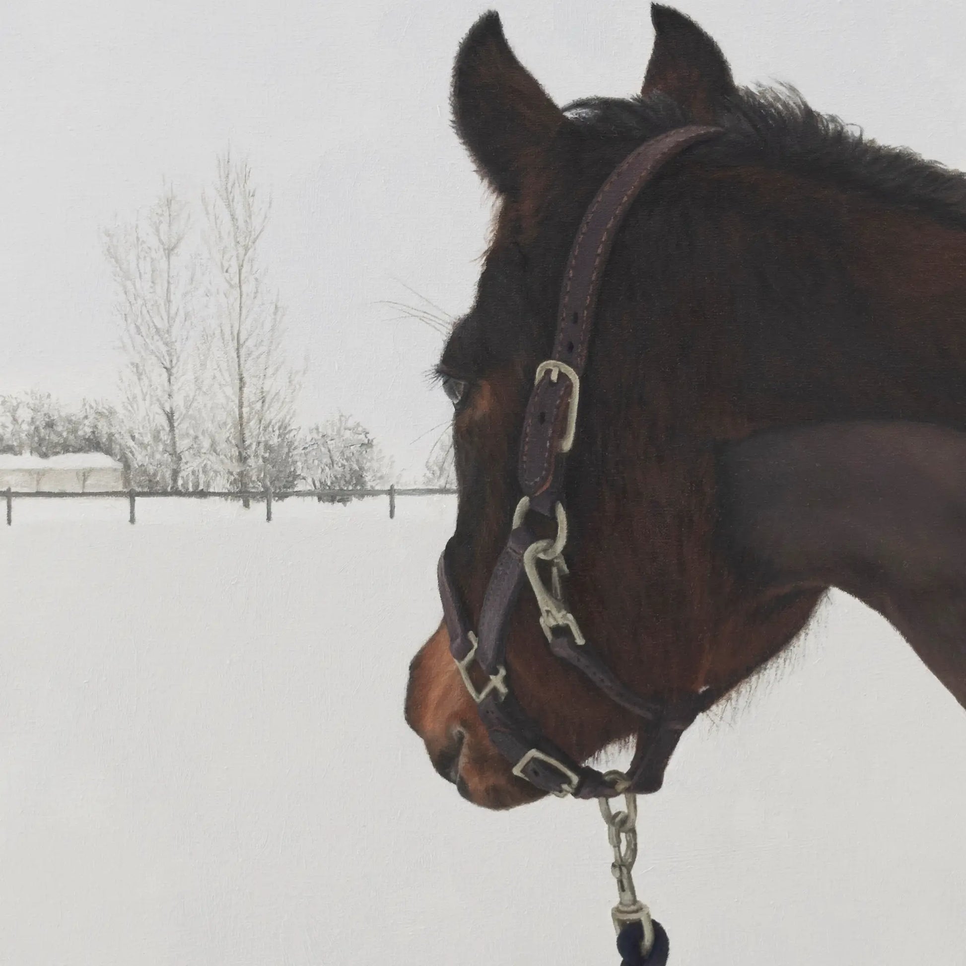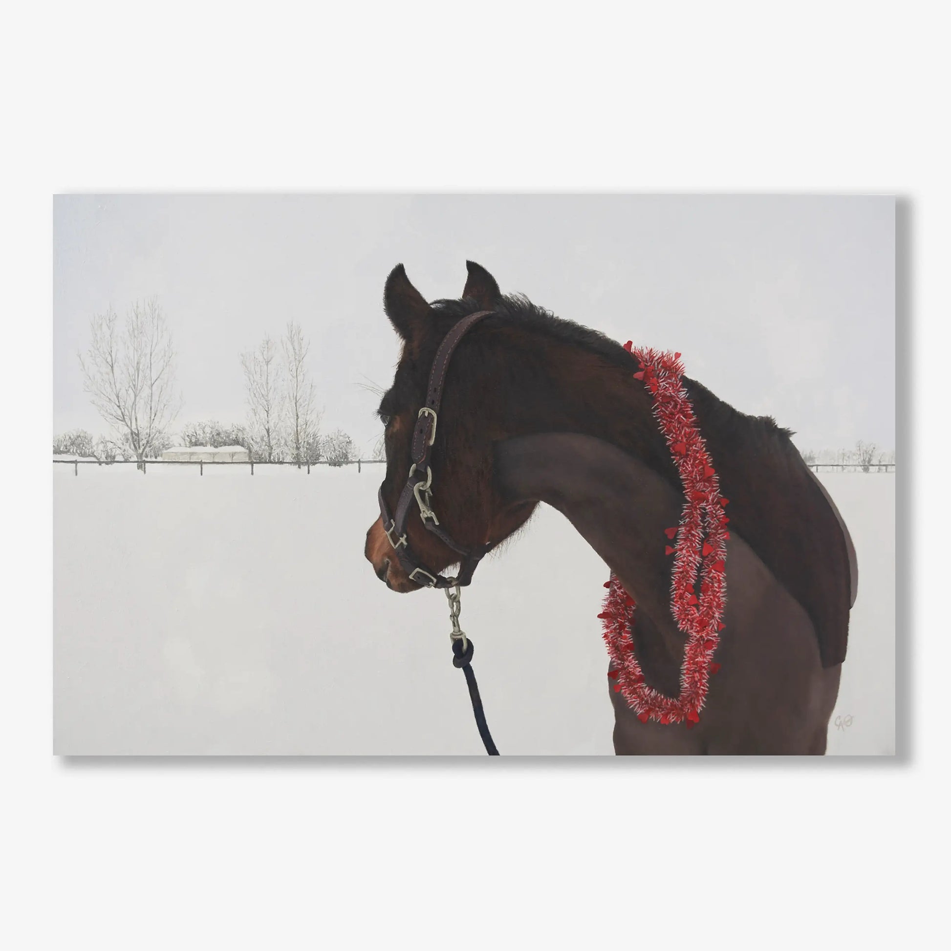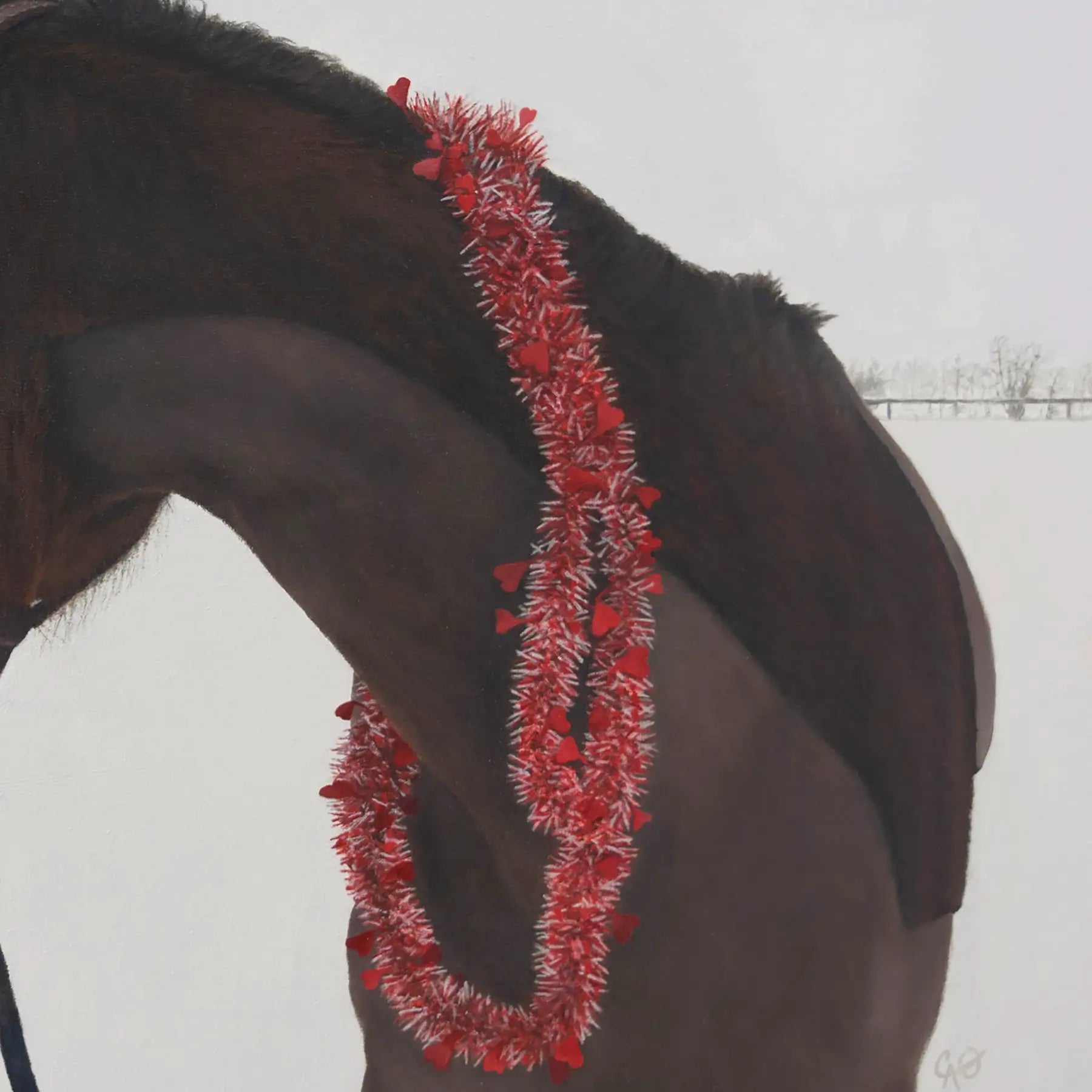 This painting captures a show mare who is loved and adorned with a Valentine's celebratory garland of hearts. Surrounded by the quiet stillness of newly fallen snow, she gazes back, in a gesture, to signify that it’s time to use her ambling gait back to the stables.