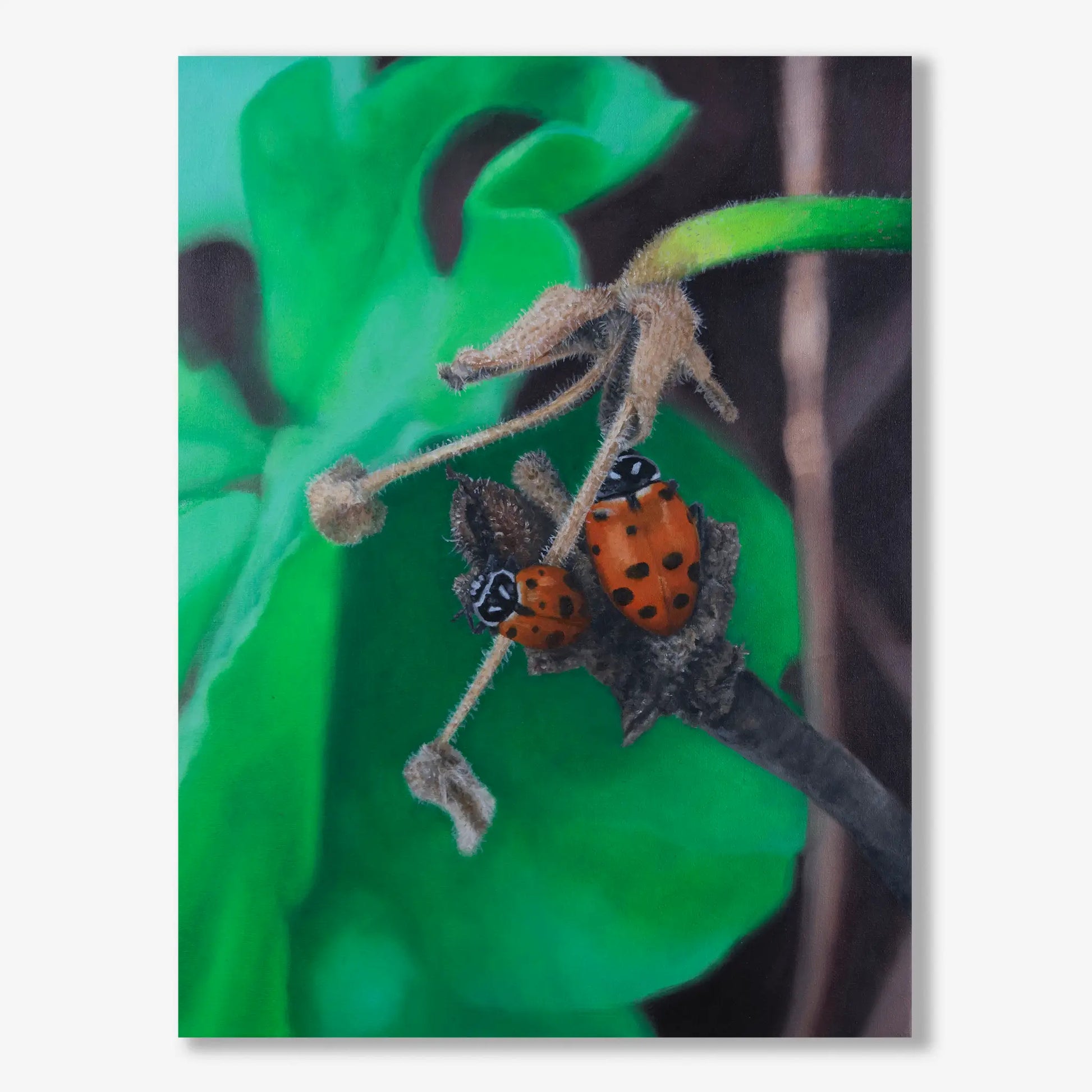 This painting is part of a series that features beloved garden ladies. The compositions accentuate the play between ladybugs and leaves, where sweet, slow-moving, mini spotted red "candies" complement the softness of the surrounding garden textures.