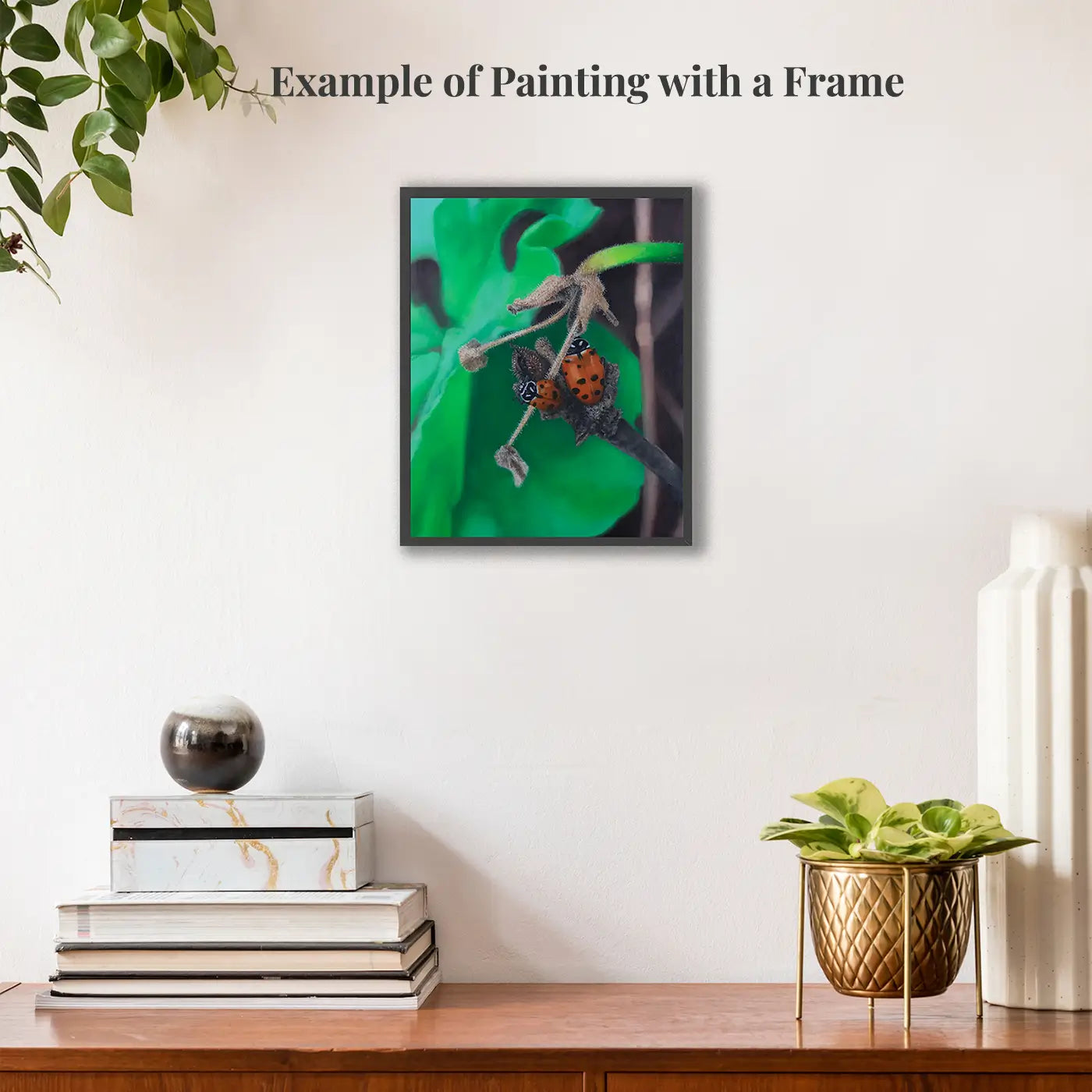 A celebration of nature and garden life, this artwork featuring red gems in their habitat, will bring a relaxing, delightful allure to any decor.