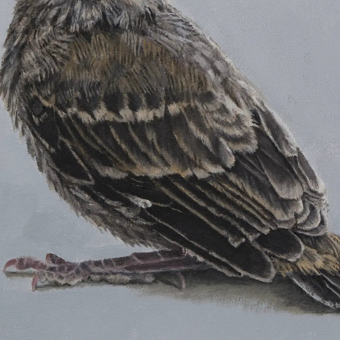 Baby birds from 13-14 days old are Fledglings. When it’s time to learn how to fly, they hop or flutter out of the nest. One day, a fledgling with fluffy down still left on its head landed on my front porch. The moment was so cute that I grabbed my camera to capture its innocent essence as a reference for a painting. He was not intimidated by me or my camera, but stood still, allowing me to capture various poses before he flew the coop!