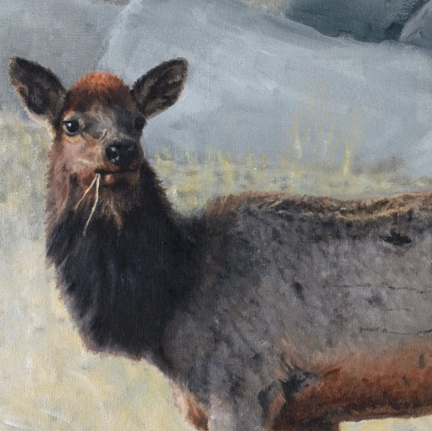 This painting captures the rustic beauty and behavior of the mountain elk. A cow elk stands at the grassland’s edge in Soda Creek, Evergreen. She pauses her grazing, dry grass delicately hanging from her mouth, in a gaze of tender curiosity.