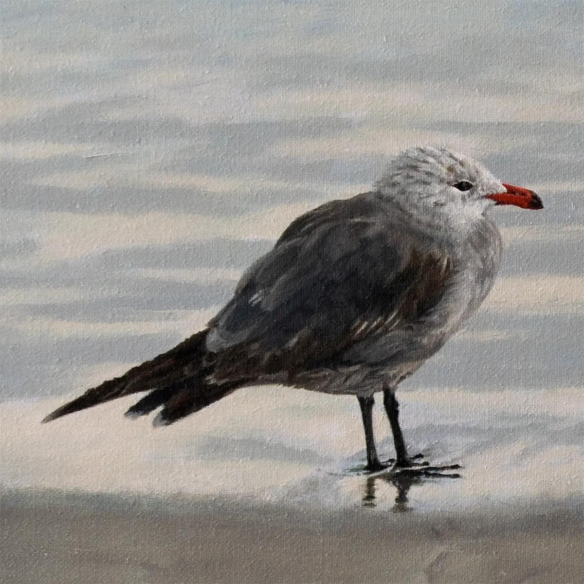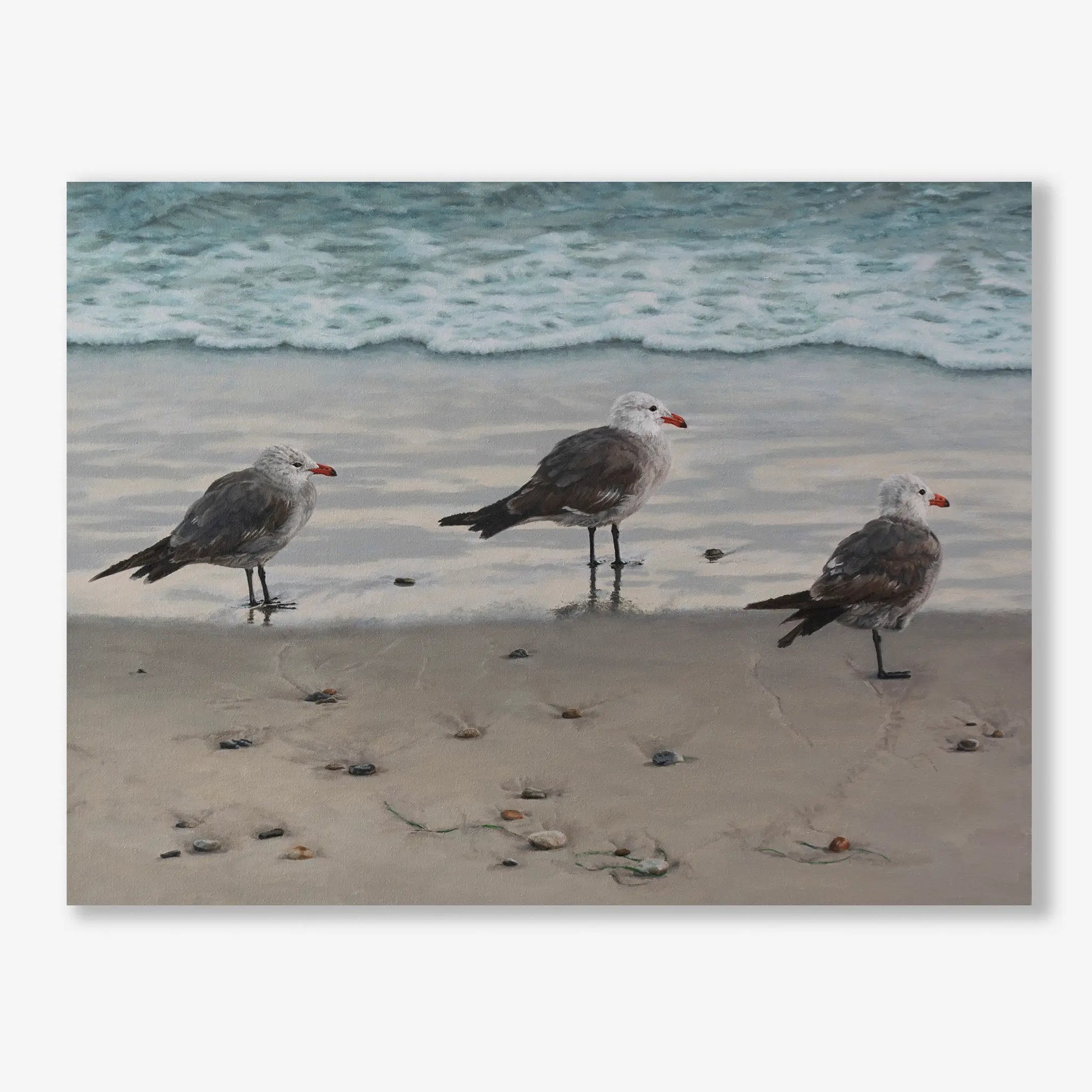 Three seagulls stand in sync, entranced by the setting sun. Foamy surf recedes at low tide, revealing sea-polished rocks, gently wrapped in seaweed. This painting captures the calm, coastal mood of early evening.