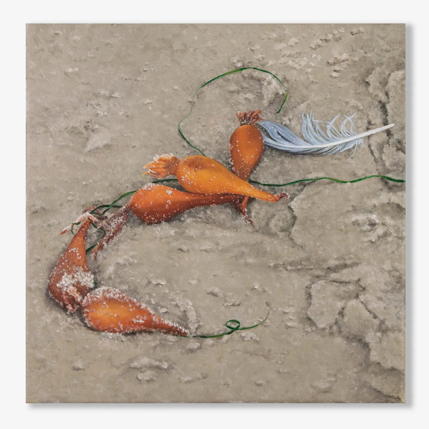 This small original celebrates the earthly gems found at low tide, where the sea once covered sand. Like a gesture of love between a feather from the air and kelp bulbs from the sea, temporarily together before the waves pull them apart, the imagery evokes the visual serenity of life by the sea.