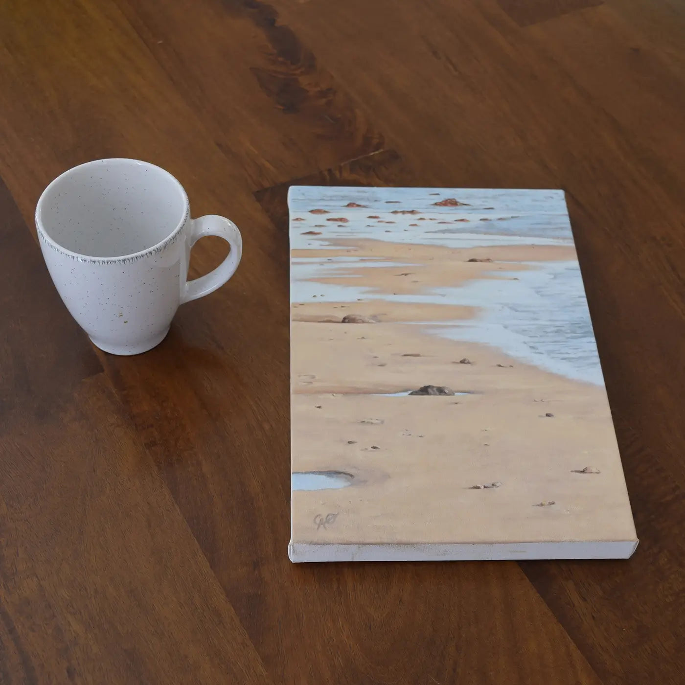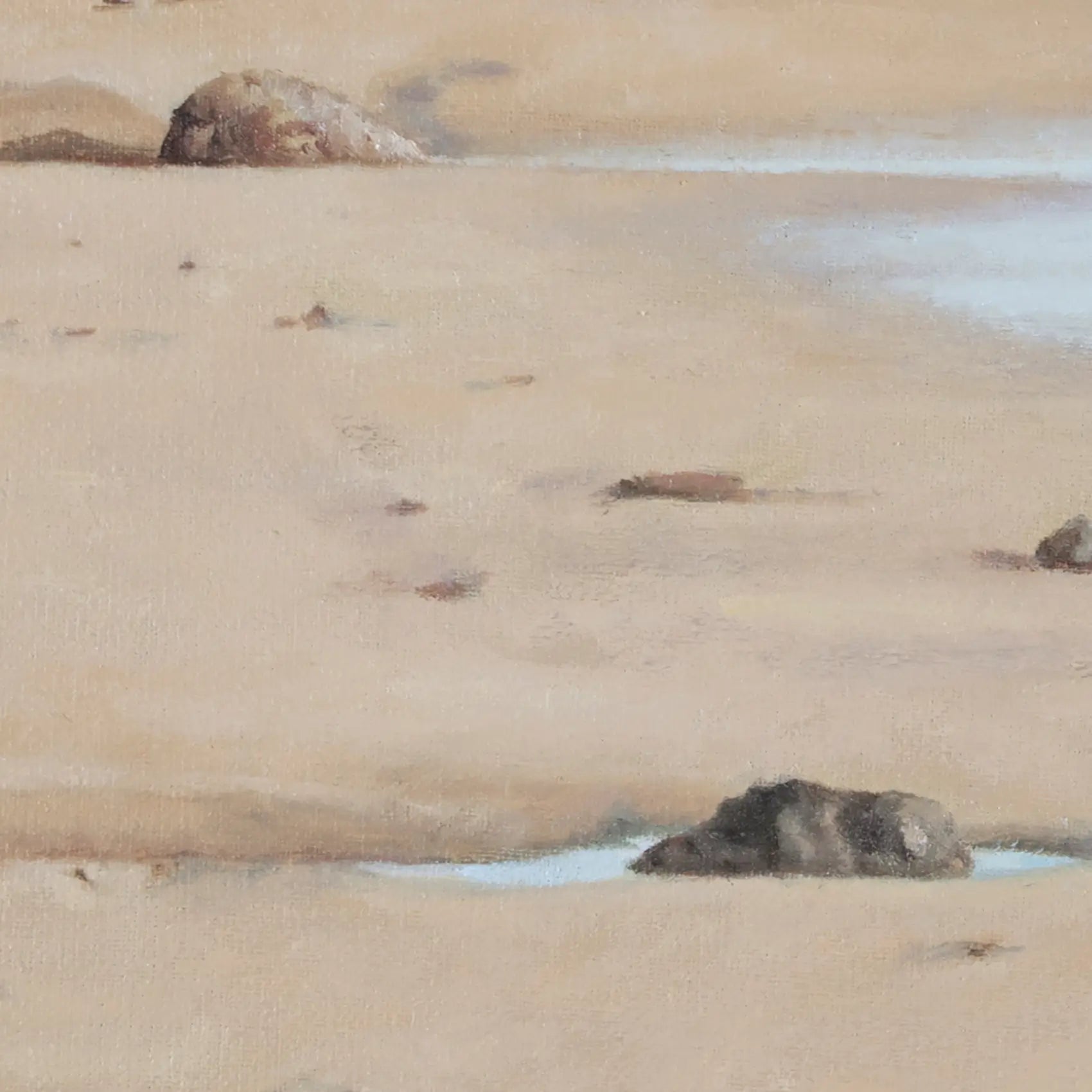 This painting captures the rhythm of the sea, where low tide shapes intricate patterns among sand, water, and textured coastal rocks, revealing a serene stillness.