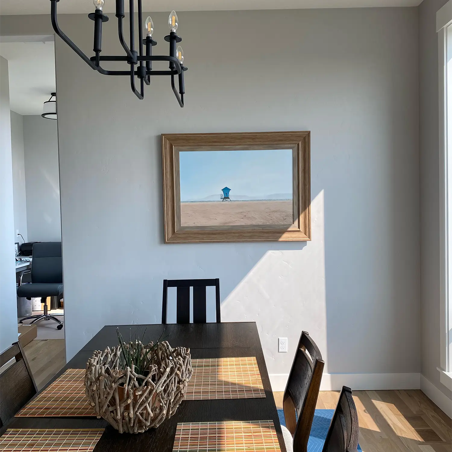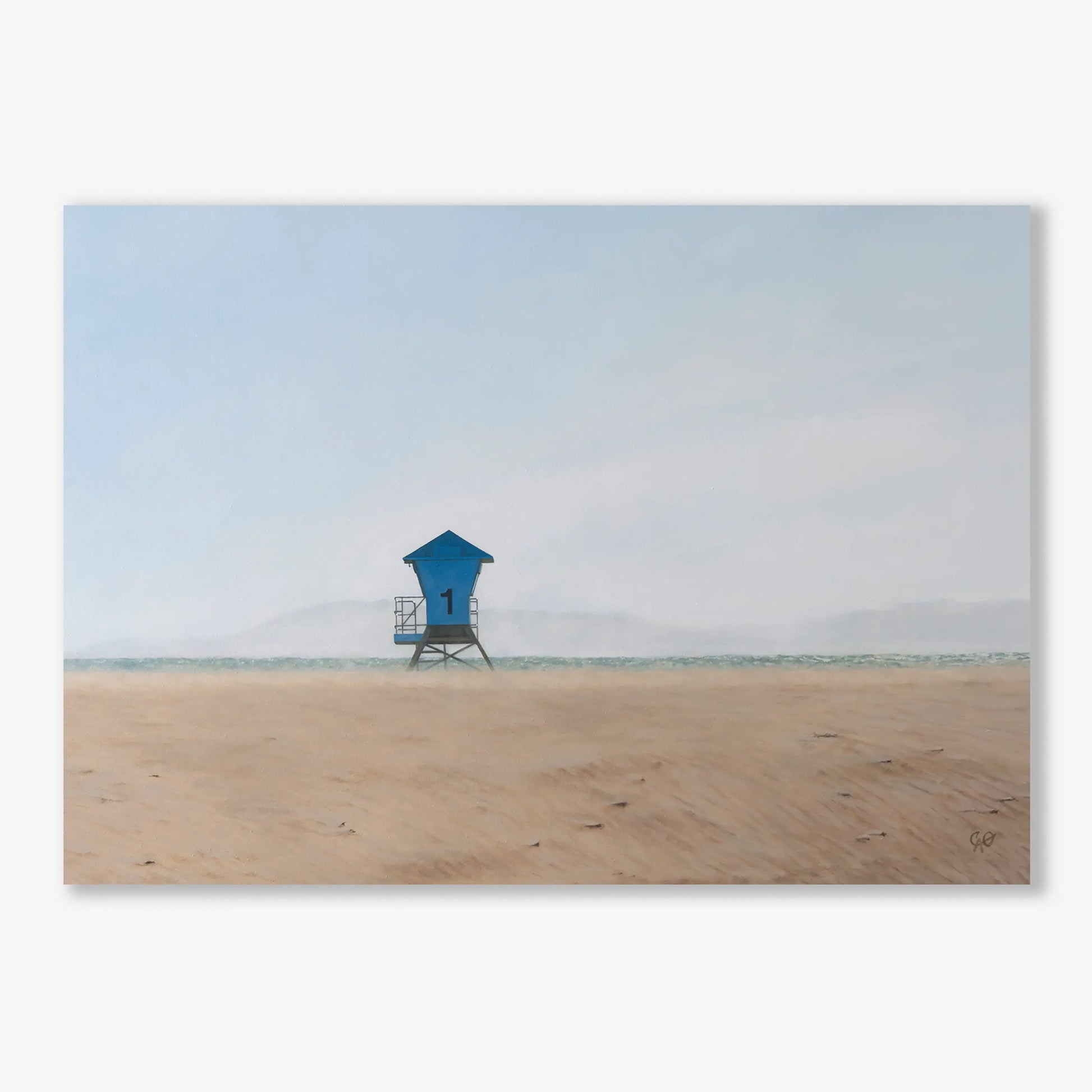 This painting captures the beauty of the coast during winter's lull. A haze of sandy air veils green-blue winter seas, creating a billowy vignette over mountains in the background. A lifeguard tower, aptly named No. 1, quietly stands in solitude, its rails reflecting the pale sunlight, as if anticipating the bright warmth of summer.