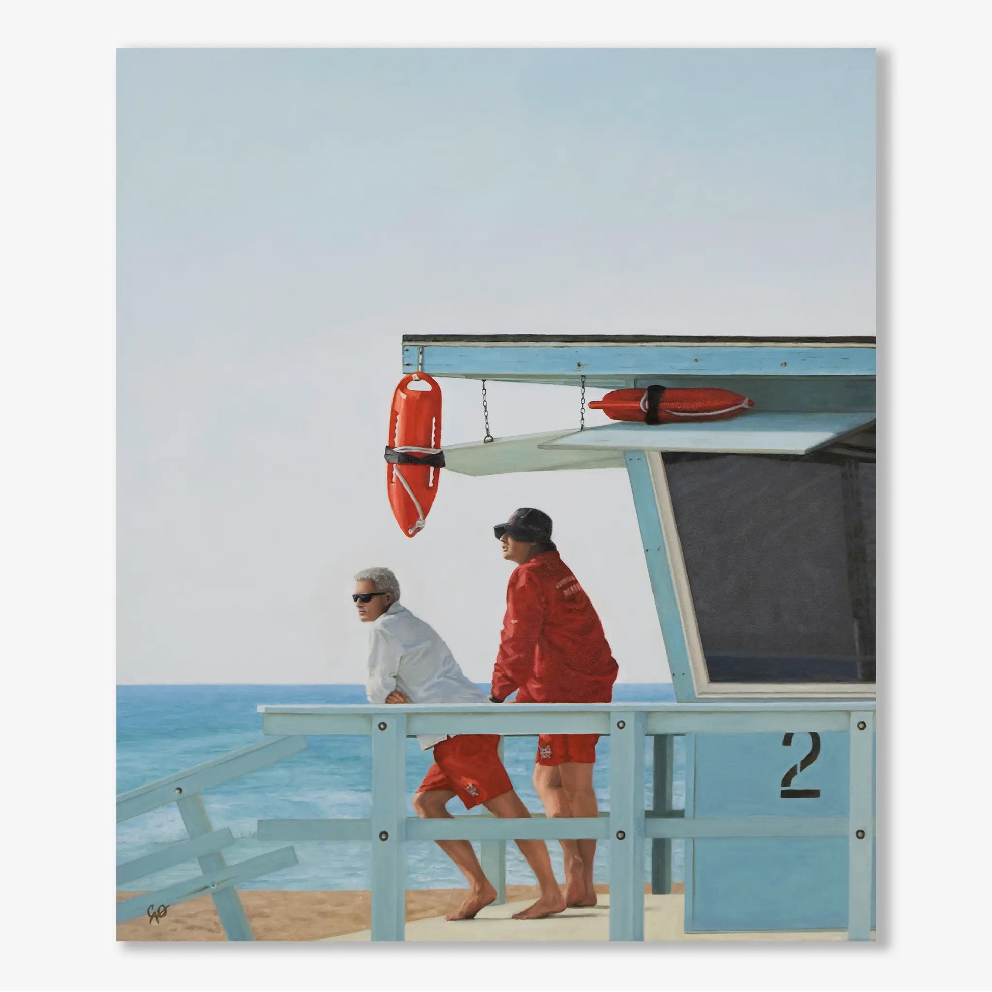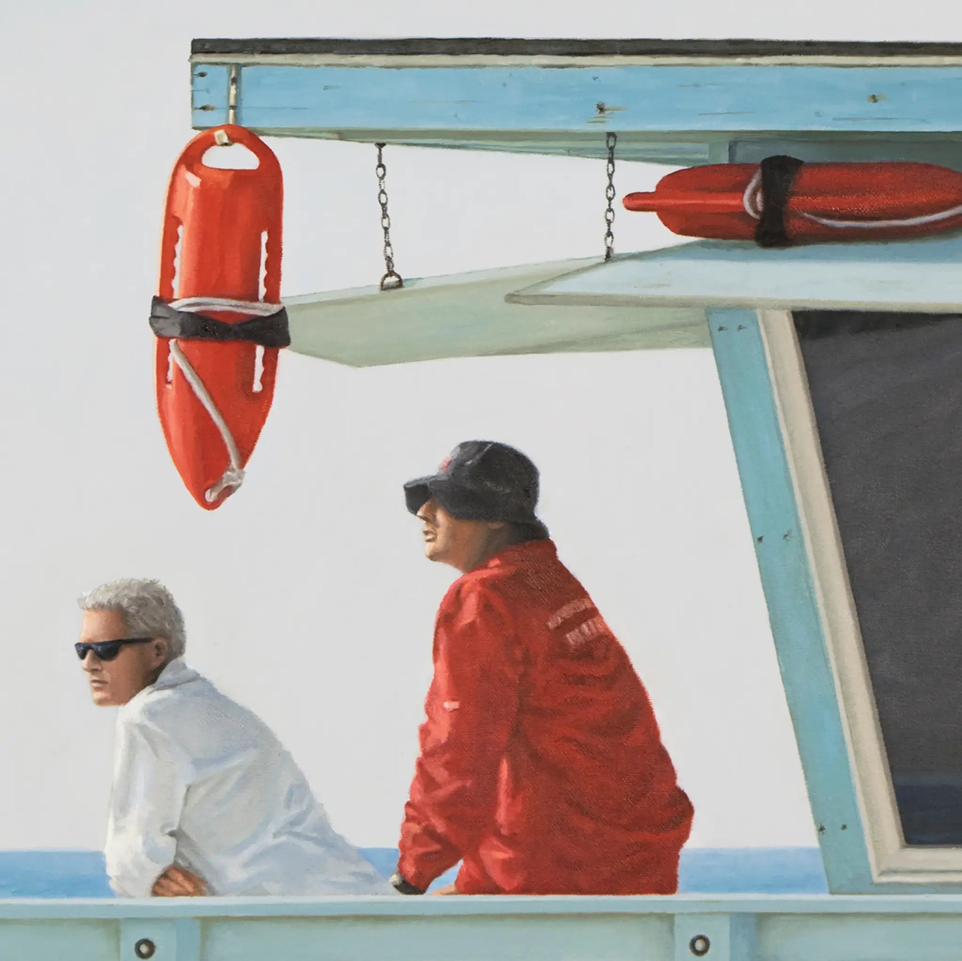 This original oil painting captures a moment in the life of beach lifeguards at work. They lean on the tower rail, monitoring the sand and water with keen eyes. The recognizable bright orange of their clothes matches the rescue cans stored within reach. The pale sea-colored tower complements the orange yet blends seamlessly with the ocean and sand landscape.
