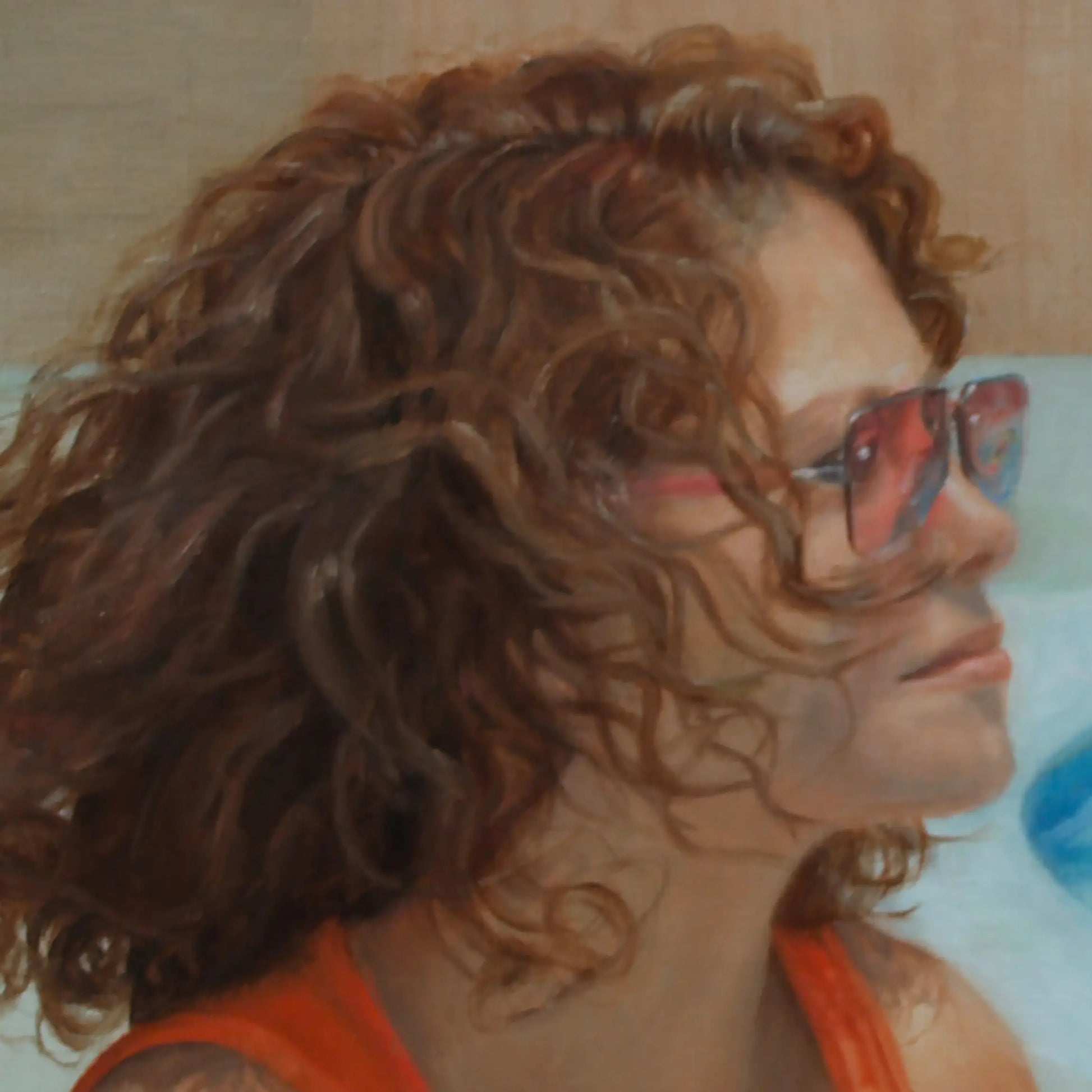 This painting of a sunny day by the pool portrays a time of relaxation. The imagery was created when a soft wind blew through the model's hair, lifting gentle curls. The moment was captured in the reflections in her sunglasses and a striped raft of colors floating near the shallows, creating a summer-day allure.