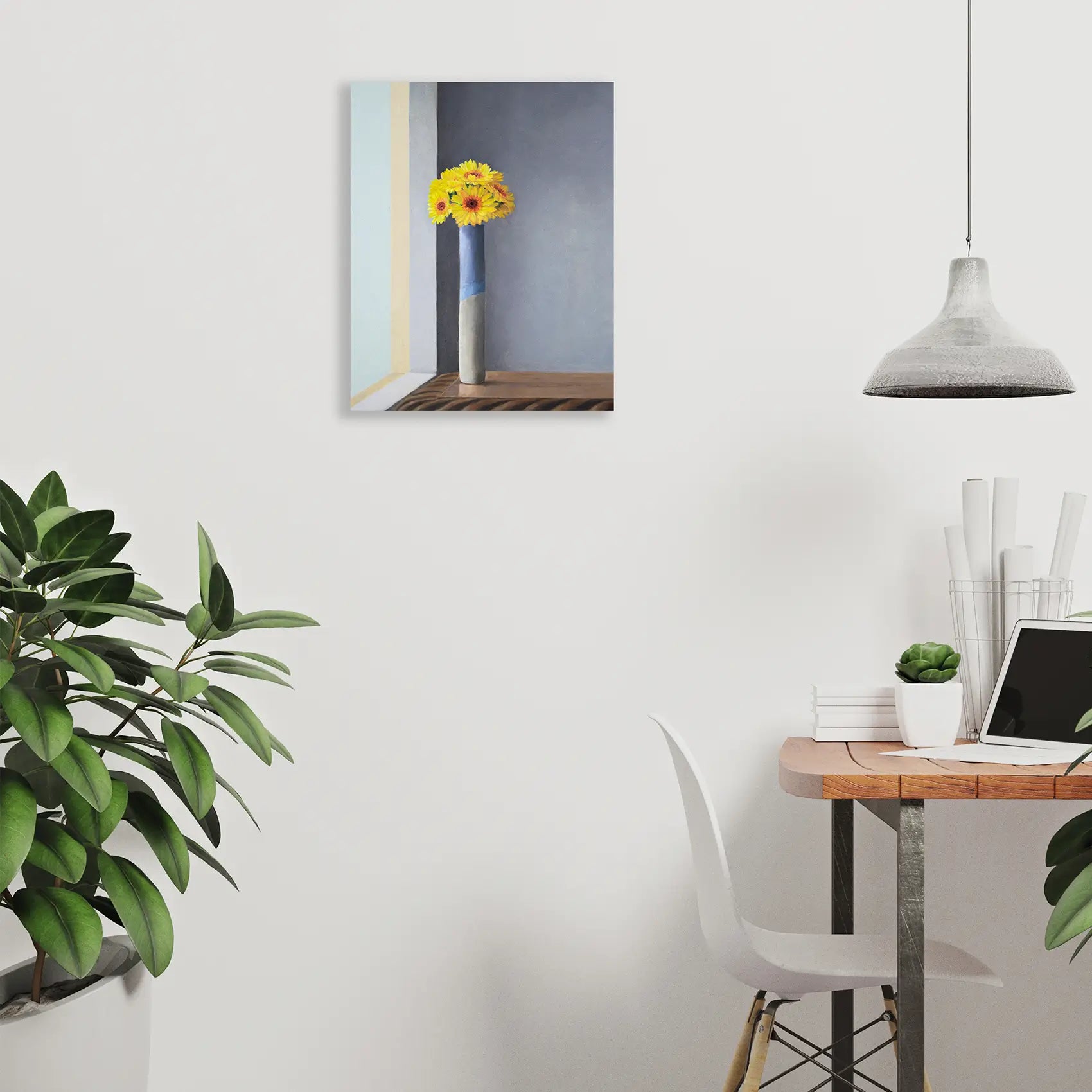 A Vase of Gerbera daisies welcomes the warm morning sun. Bunched tightly in a hand-made ceramic vase, they appear to stand at attention to say a radiant “Good Morning.”