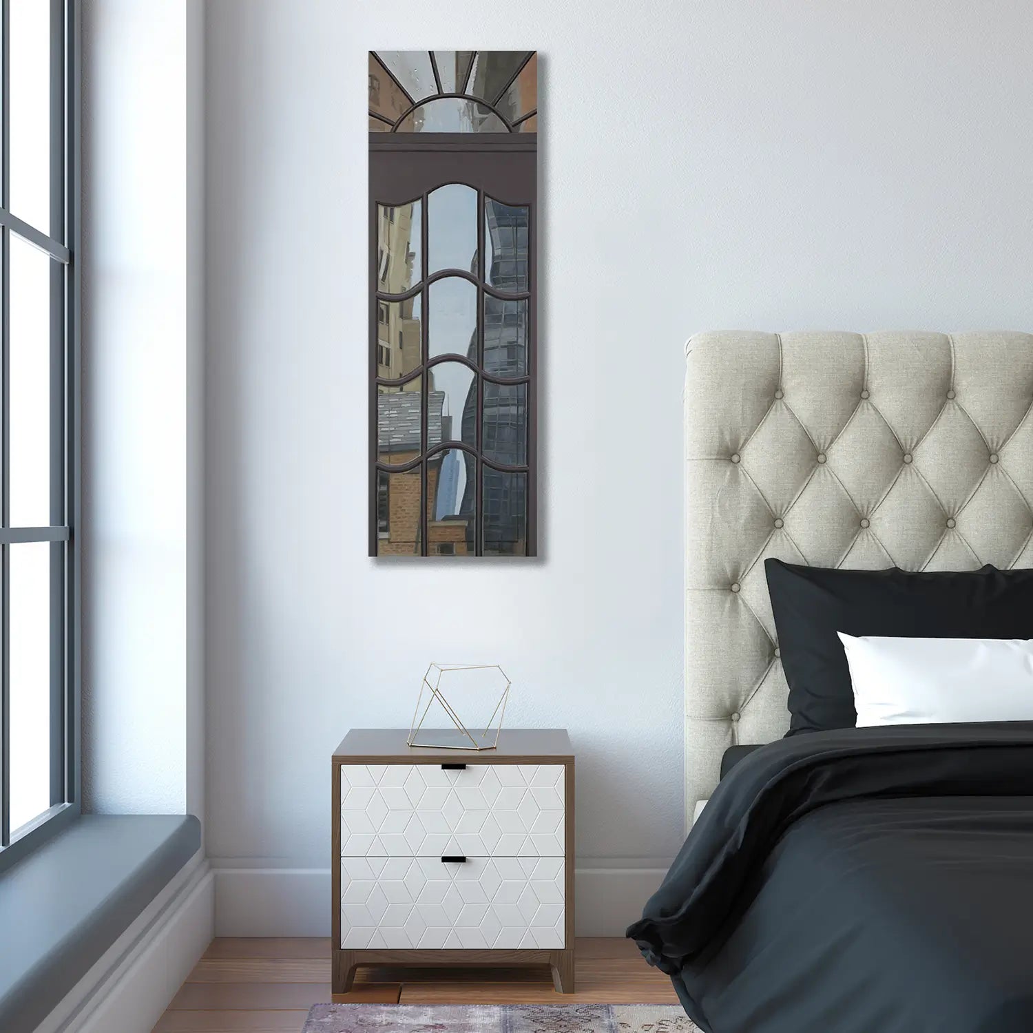 This oil painting centers on the aesthetics of the historic doorways in Chicago's Gold Coast. The composition highlights the intricate artistry of the entry door design, including glass that reflects a gestural distortion of city reflections. A companion painting, “Gold Coast Red Burst", also captures the architecture design of a city entry door. The two paintings are the same size and can be purchased individually or as a dynamic architectural pair, based on availability.