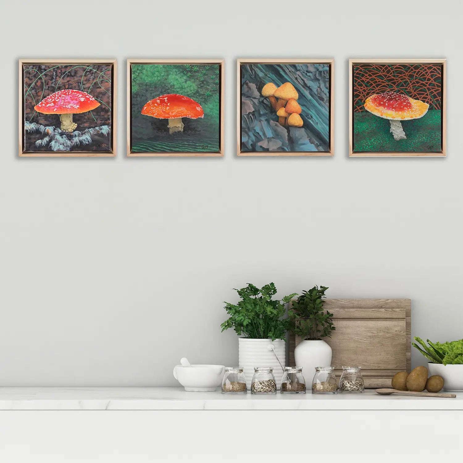 This painting celebrates the mystical mushrooms strewn among the mixed-conifer forests of the Rockies. If you are on a summit adventure, this iconic red-and-white beauty—the famed Amanita mushroom—is a magical sight, but beware: they are poisonous.