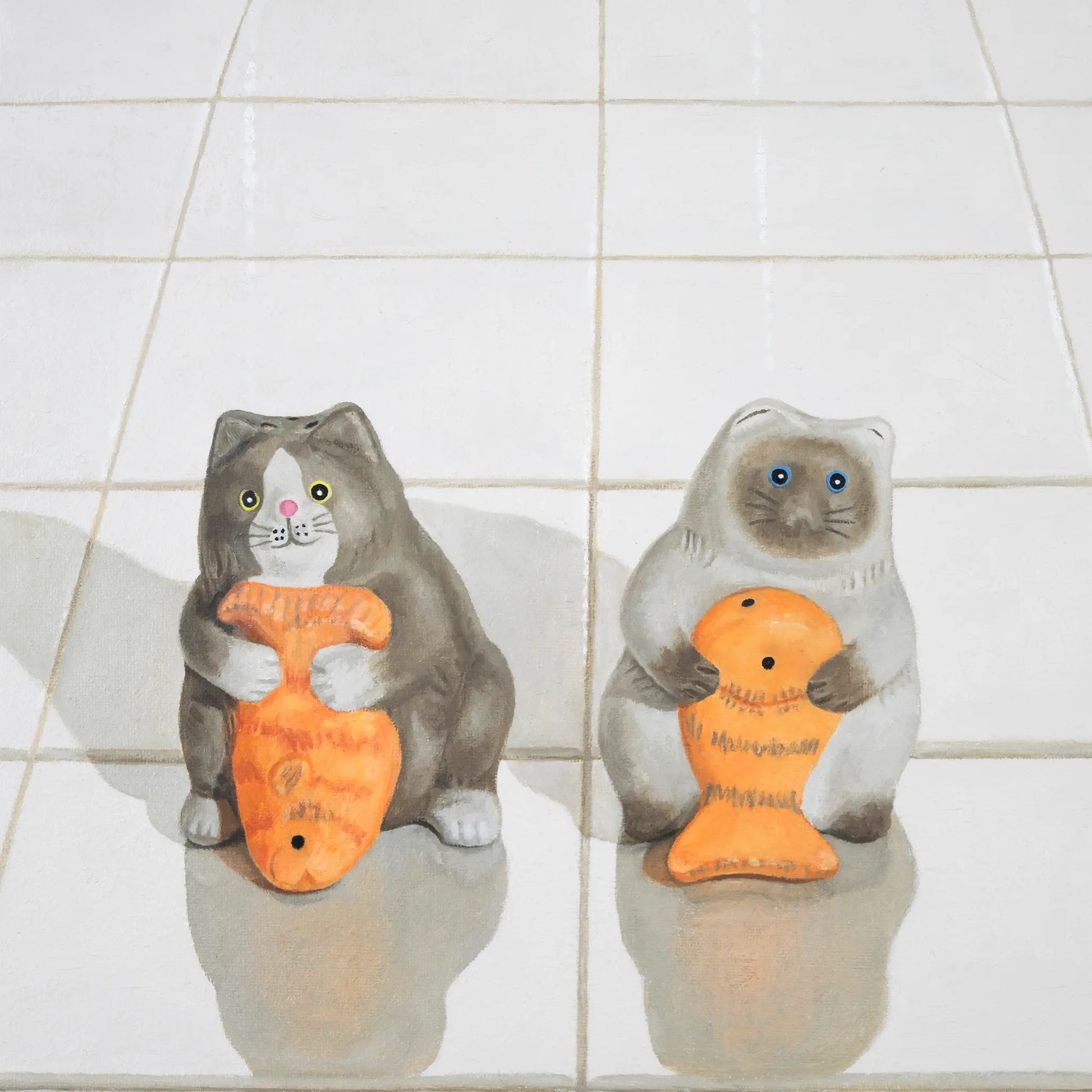 Based on a painting created as part of my "Tchotchke Series", this imagery features found shakers from a resale shop, staged in a kitchen scene.