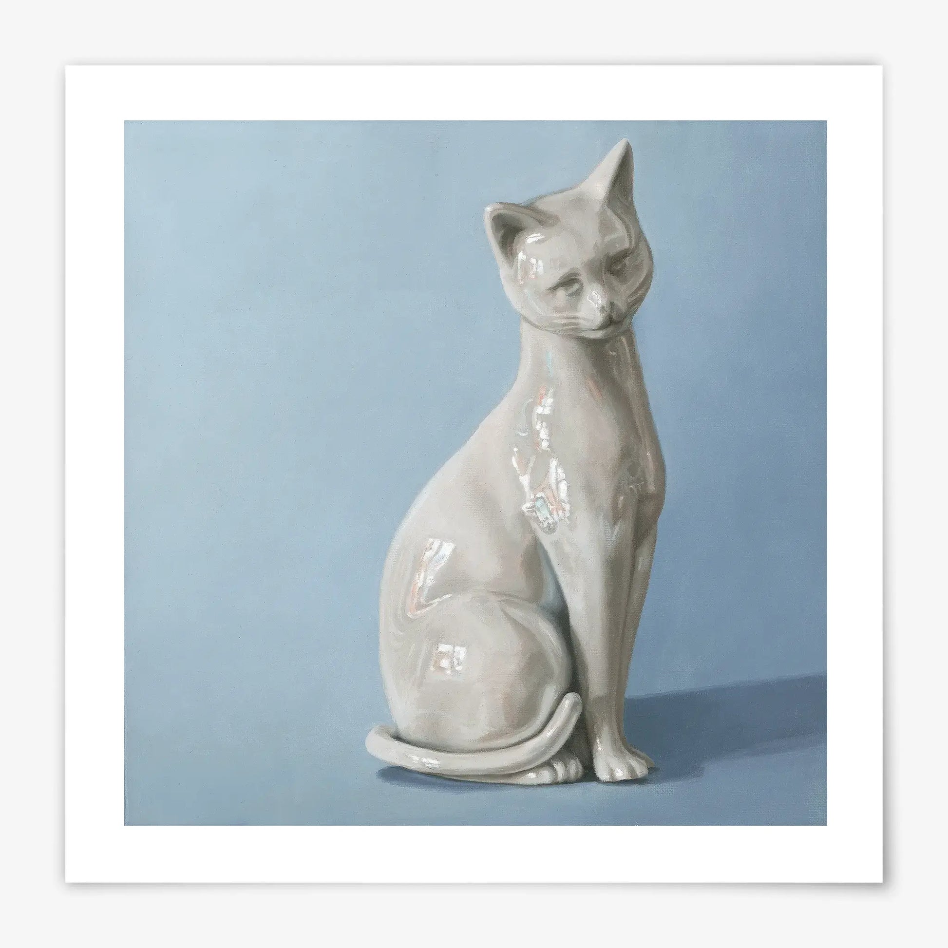 This fine art print is from my first "Tchotchke Series" painting, in which I stage still life arrangements with collectibles from resale shops. When I saw this porcelain cat, I was excited to stage it in front of a window, where I artistically accentuated the light's reflections. Its smooth porcelain and bent-head stance convey a sense of eminence and feline calm.