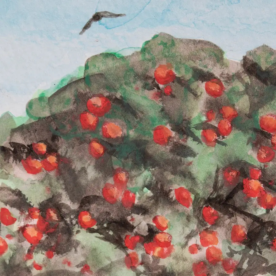 Majestic and mythical, this painting celebrates the spiritualities and the symbolisms of apple trees. Trees are physical and provide spiritual nourishment, transformation and liberation, union, and fertility. These are the reasons why so many cultures covet these ancient living beings.