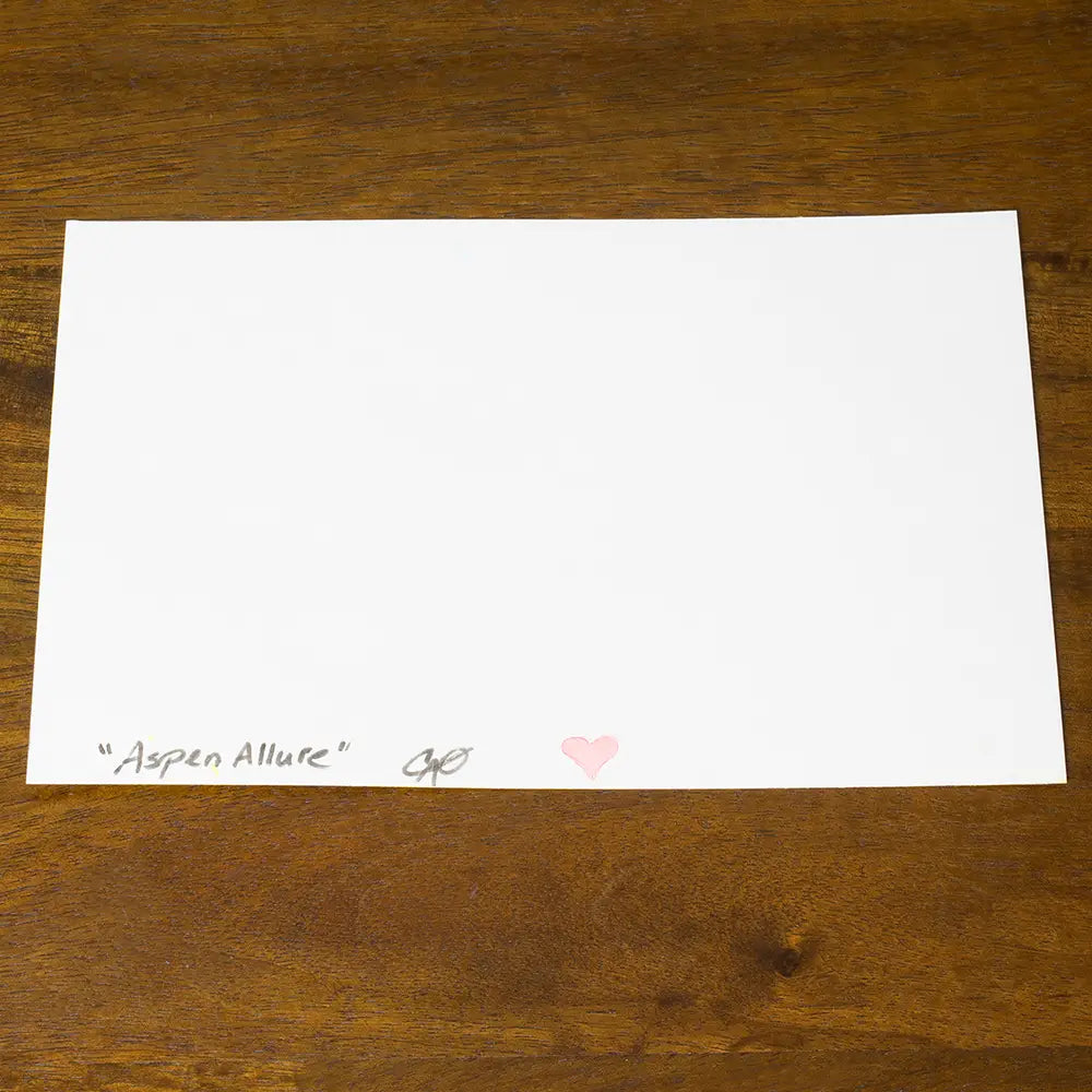 This watercolor, made with love, features these stunning trees, whose leaves transform the Autumn landscape with vibrant yellow and orange. The elegant Aspen trunks reach skyward, with silvery-white bark marked by distinctive dark horizontal tracks and self-pruned scars that resemble eyes.