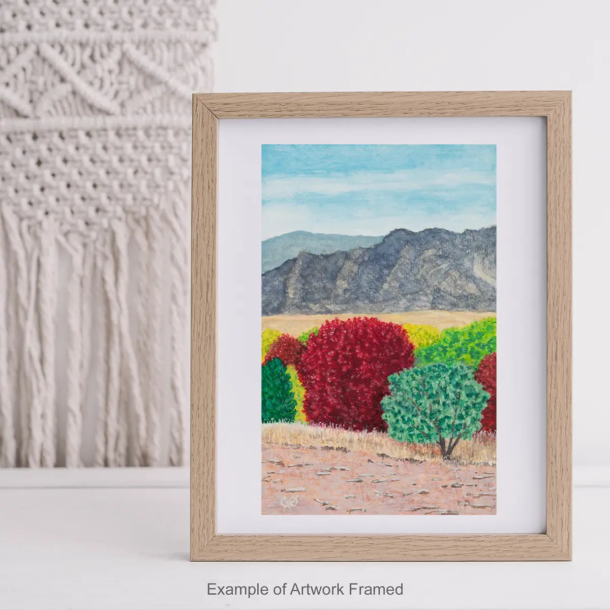 This watercolor, made with love, highlights an autumn landscape with the rich shades of the season’s colors, inspiring a sense of natural beauty and warmth. The Maple tree is featured, with its beautiful crimson and ruby red colors.